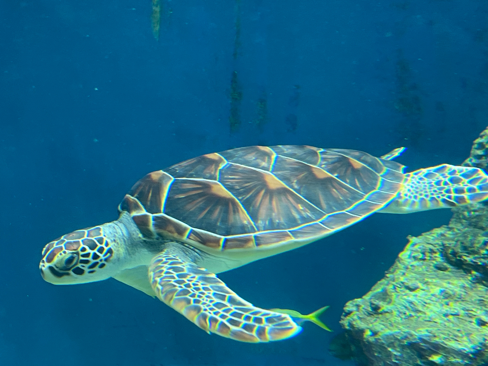 ウミガメ界のアイドル。 太陽が昇る様子に似た模様がとても綺麗で美しい。 海藻や海草などを食べ、他のウミガメより優しい顔をしている(主観)。
