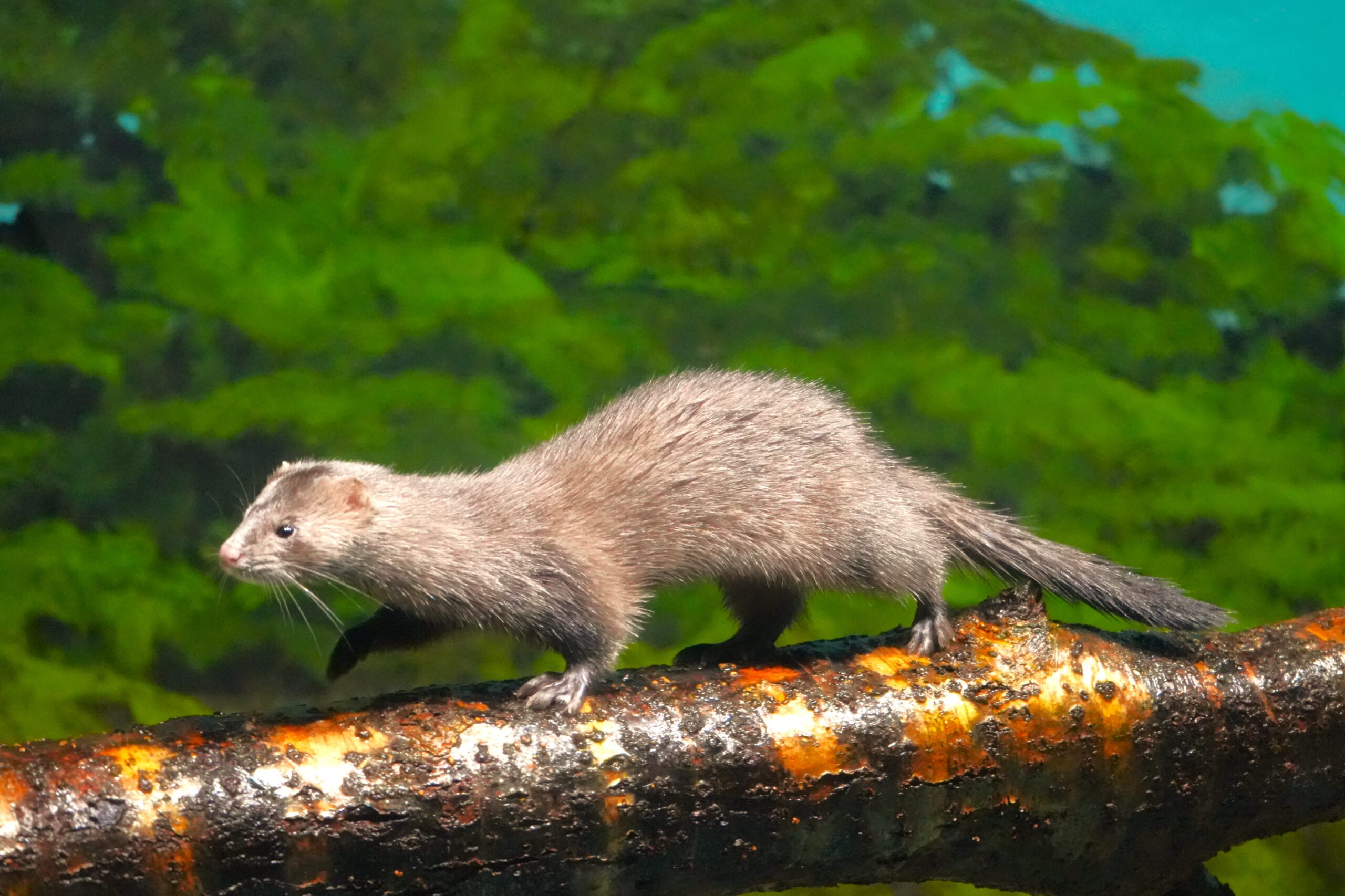 アメリカミンクは泳ぎが得意で、魚やカエル、小型の水生生物を巧みに捕まえます。夜行性で暗くなると活動し、静かに川や池の周りを探索します。毛皮は光沢があり水を弾くので体が濡れにくく、寒さにも対応できます。動物園や水族館では、水中を器用に泳ぐ姿や、水面で元気に動き回る様子を間近で観察でき、その素早い動きに目が離せなくなります。