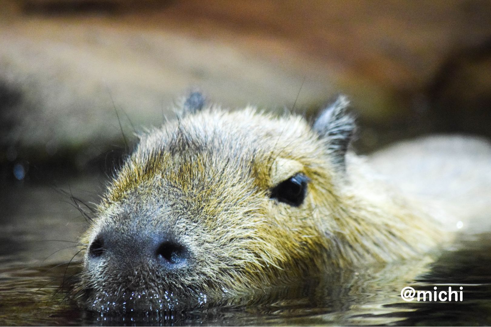 カピバラは、水辺でのんびり過ごすのが大好きな、穏やかな草食動物。群れで生活し、お互いに体を寄せ合って休むこともあります。泳ぎも得意で、水中で身を守ったり移動したりします。仲間同士で頭や体をなで合うなど、スキンシップを取る様子も見られます。観察すると、そののんびりした様子にほっとします。水に浮かびながらうとうとしている姿は、つい見入ってしまうほど。