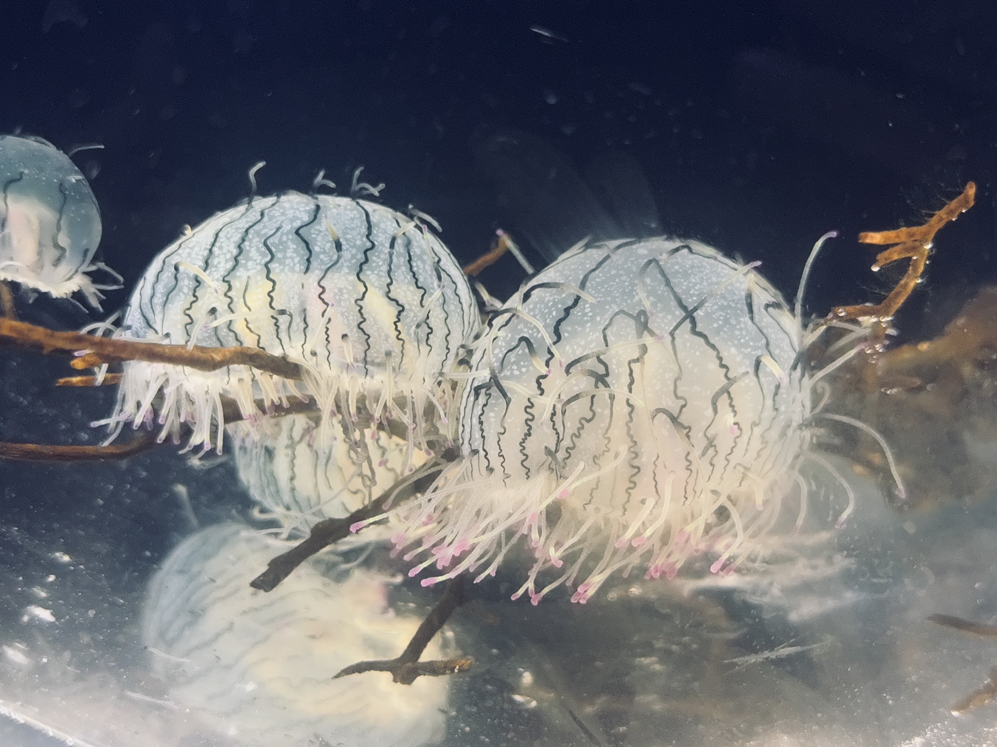 花が咲いたように、鮮やかで美しい傘を持つハナガサクラゲ。この傘の縁にある触手は、まるで宝石のようにキラキラと輝き、見る人を魅了します。しかし、この美しい触手には、とても強い毒があり、他の魚は近づくことができません。昼間は岩陰などに隠れてじっとしていますが、夜になると活動を始め、獲物を求めて動き回ります。その幻想的な美しさと、ユニークな生態に注目して、心ゆくまで観察してみてください。