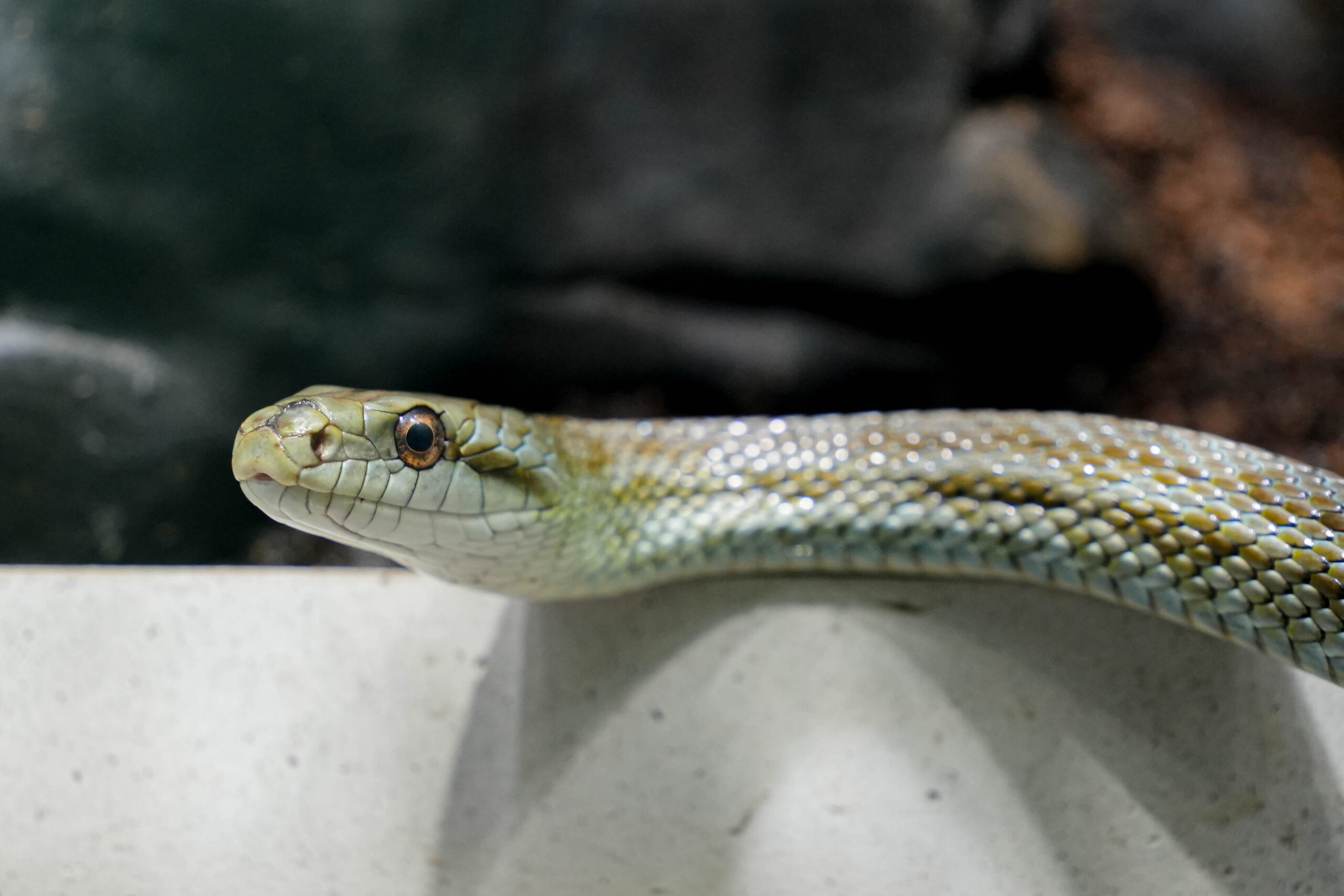 日本で最も馴染み深いヘビの一つ、アオダイショウ。その名の通り、成長すると青みがかった緑色になる。彼らは毒を持たないおとなしいヘビで、水田や森林、さらには民家の屋根裏まで、身近な場所で見かけることができる。最大の特技は木登り。垂直に近い壁や木も器用に登り、鳥の巣にある卵やヒナを食べる。その俊敏な動きと、身近に生きる力強い生命力が魅力的なヘビだよ。