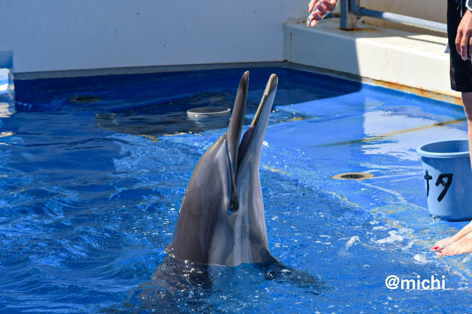 スラリと伸びた長い口先と、体の側面にある鮮やかな黄色い模様が特徴的なハセイルカ。以前はマイルカの仲間とされていたが、研究によって別の種類と認められた、特別なイルカ。野生では、数百頭、ときには数千頭もの大群で行動し、船の周りを高速で泳いだり、波に乗って遊んだりする姿も見られる。日本の水族館ではあまり見ることのできない貴重なイルカ。