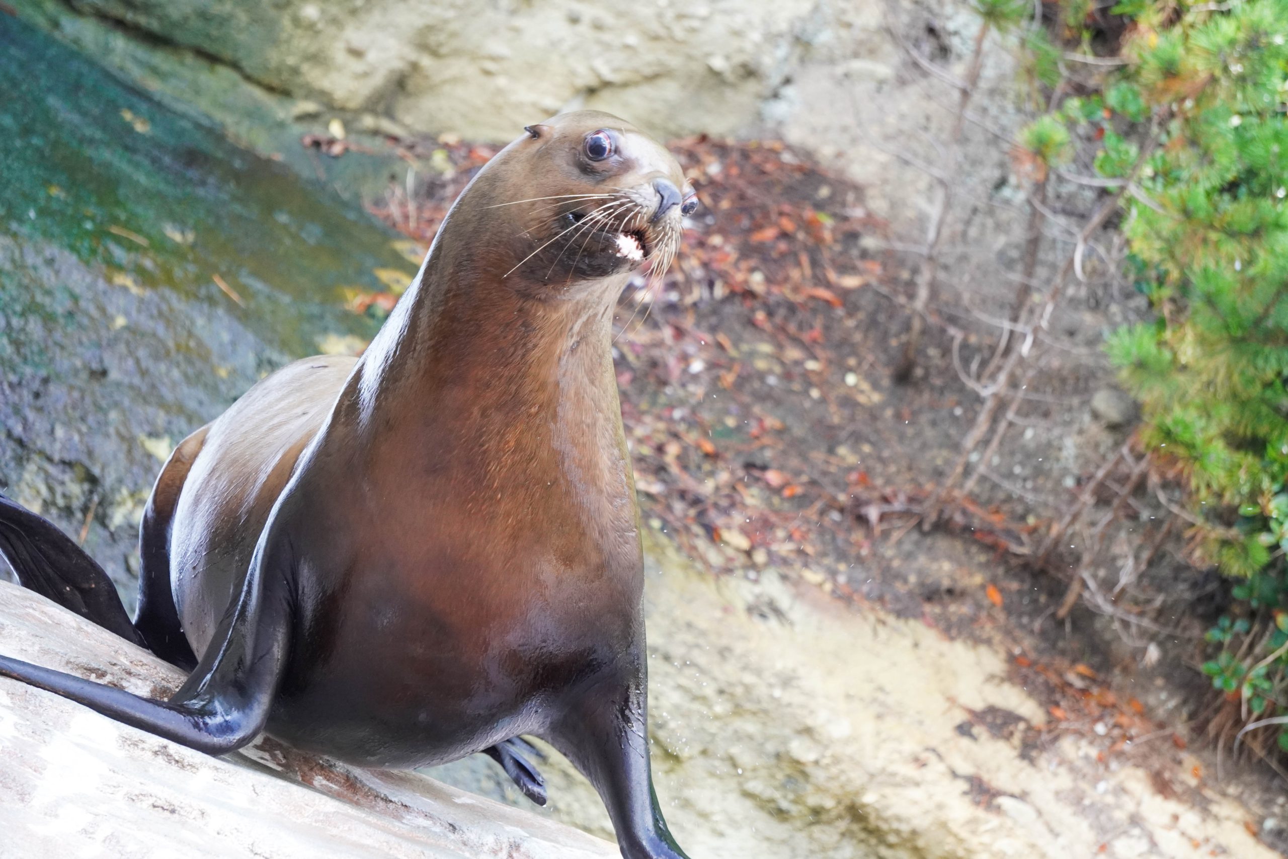 海で遊ぶのが大好きな動物です!見た目はアシカに似ていますが、少し丸みを帯びた体型が特徴的。特に、太くて強い首と肩を持っており、陸上での歩き方がまたユニークです。泳ぐのは得意ですが、陸ではゴロゴロと寝転がりながら過ごすことが多いです。トドは群れで生活し、群れの中にはリーダーが決まっていることが多いんです。