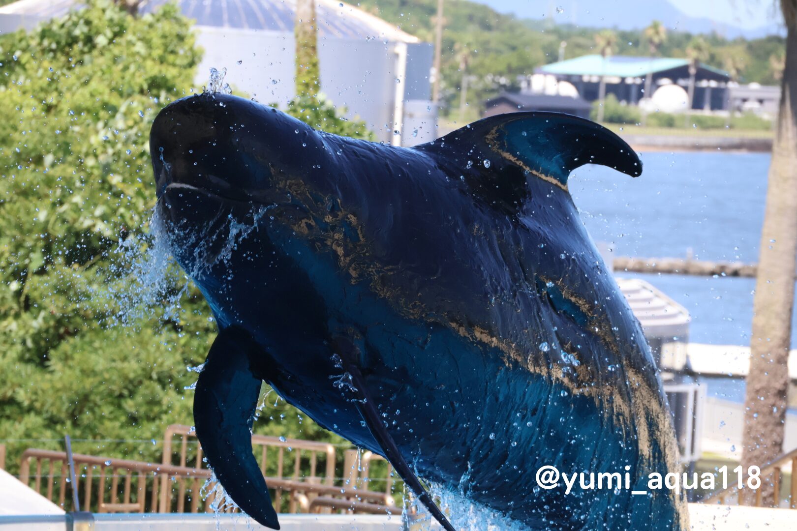 大きな頭と丸いおでこが特徴的なコビレゴンドウ。その体は真っ黒に見えるが、実は成長するにつれて、おでこや胸びれ、お腹に白い斑点が増えていく。また、群れで協力してイカなどの獲物を追い詰める、賢いハンターの一面も持っています。そのユニークな体と狩りの様子は要注目。